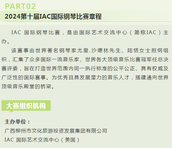 2024第十屆IAC國際鋼琴音樂節(jié)活動流程及比賽章程 發(fā)布時間:2024年05月30日 19時來源:本站原創(chuàng)瀏覽:845 人次